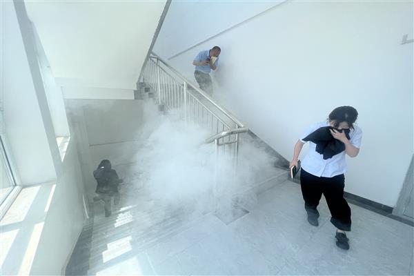 全體參會人員在安全生產(chǎn)月橫幅上承諾簽名。隨后,集團邀請億安消防的教官作安全專項知識培訓,并組織應急疏散演練。